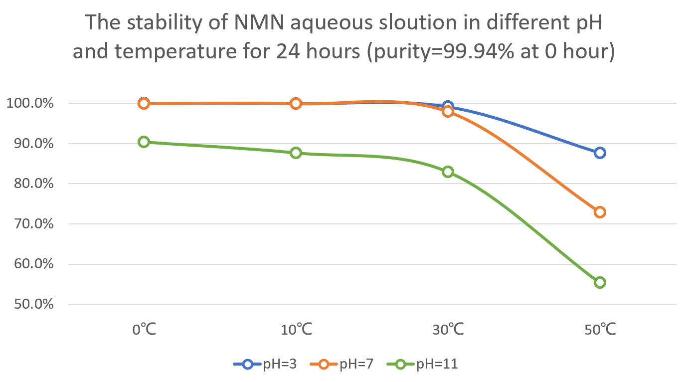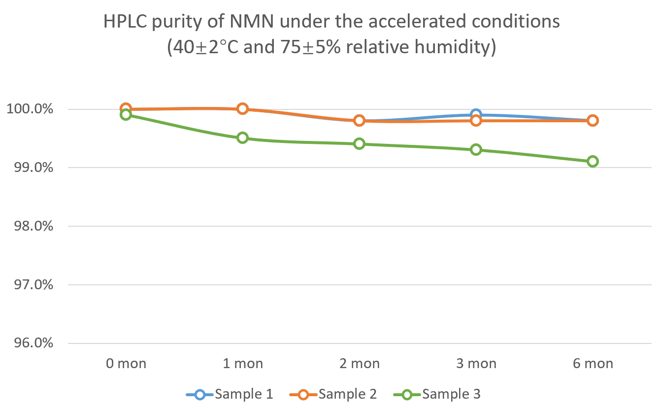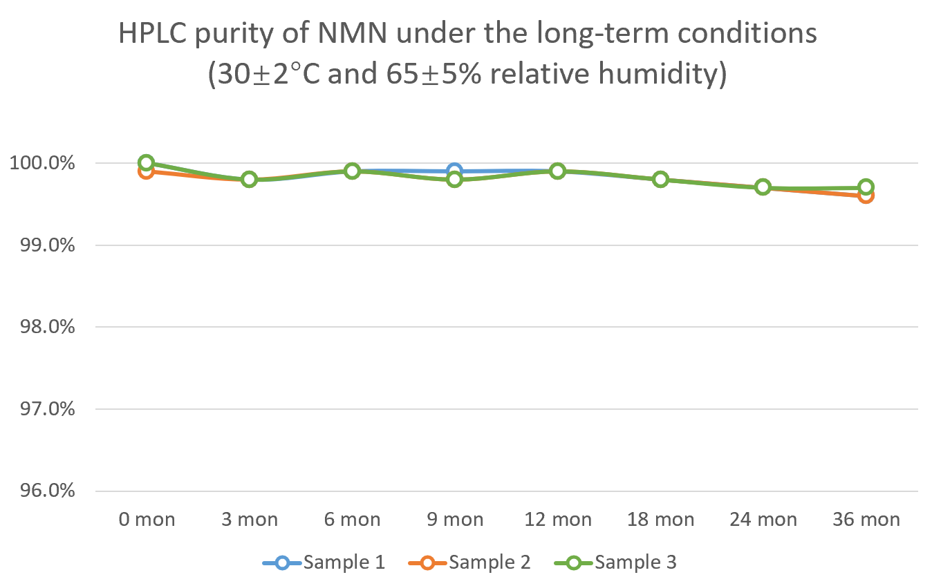Stability studies under controlled conditions show UltiNADⓇ NMN has high stability under ambient conditions (30±2°C and 65±5% relative humidity) and accelerated conditions (40±2°C and 75±5% relative humidity).