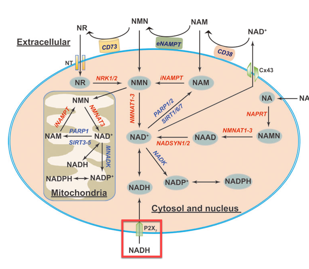 Comparison NAD+ that cannot be transported across cell membranes, exogenous NADH can directly penetrate cell membranes. It is transported across astrocyte membranes through a P2X7 receptor-mediated endocytosis mechanism. After treating astrocytes with NADH, both intracellular NADH and NAD+ levels increase.
