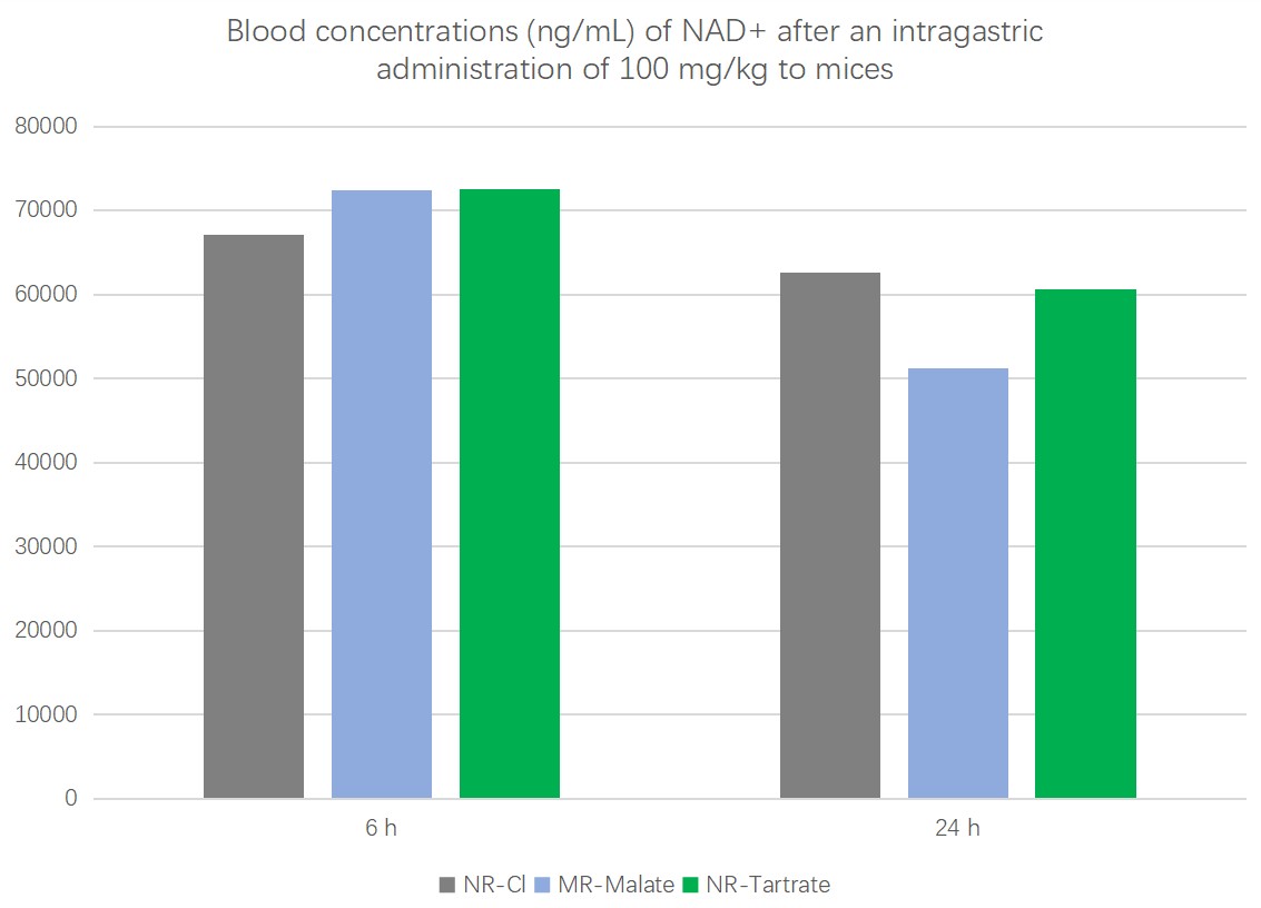 The Blood concentrations of NAD+ after a single intragastric administration of NR-Cl, NR-Malate and UltiNADⓇ NR Tartrate in mices are shown the peak concentration were no significant difference between the different dosage forms base on Cmax and AUC0-t. That means UltiNADⓇ NR Tartrate is the same bioavailability as other form of NR.