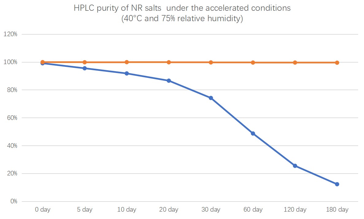 As known, NR can safely and effectively increase NAD+ in humans. UltiNADⓇ NR Tartrate is L-tartrate form of NR, comparison with other NR forms, especially NR chloride, UltiNADⓇ NR Tartrate, UltiNADⓇ NR Tartrate exhibits almost the same bioavailability, but the stability of UltiNADⓇ NR Tartrate is much better than others. In other words, with the same effectiveness, UltiNADⓇ NR Tartrate is more convenient for storage and transportation.